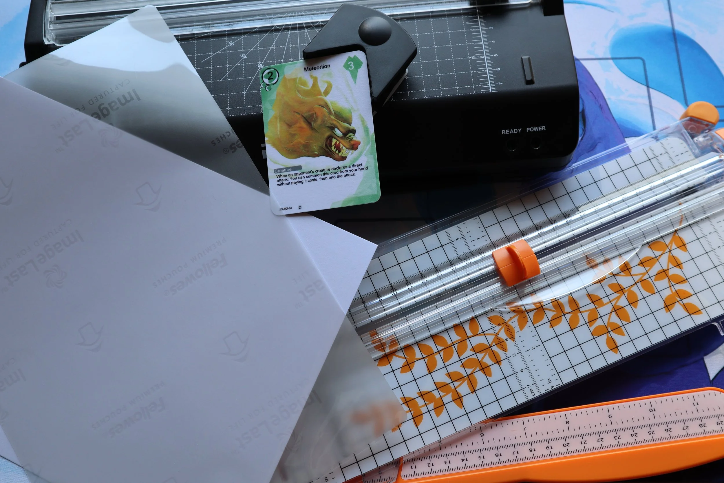 Tools that help to do quick analogue prototypes: papercutter, thick cardstock paper, a thermal laminator with pouches and a corner rounder.